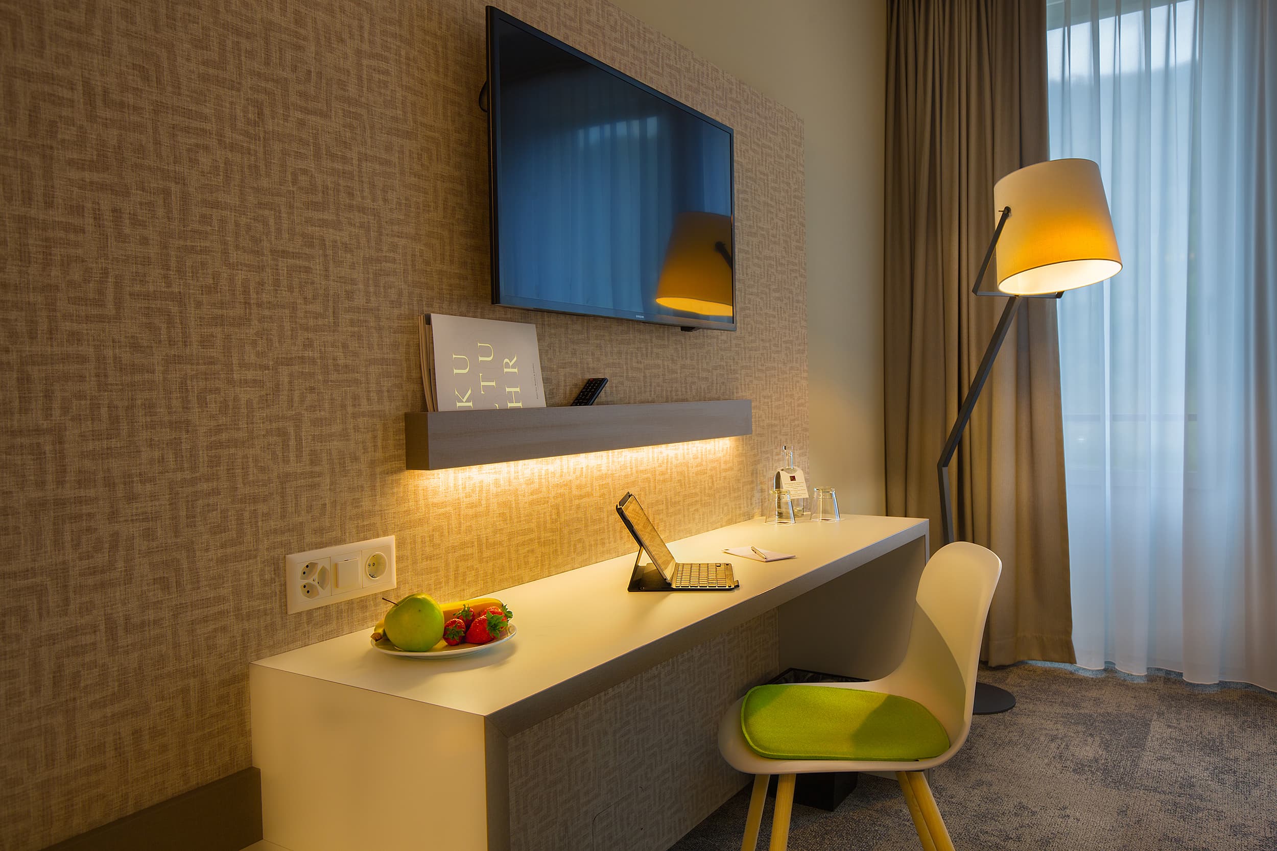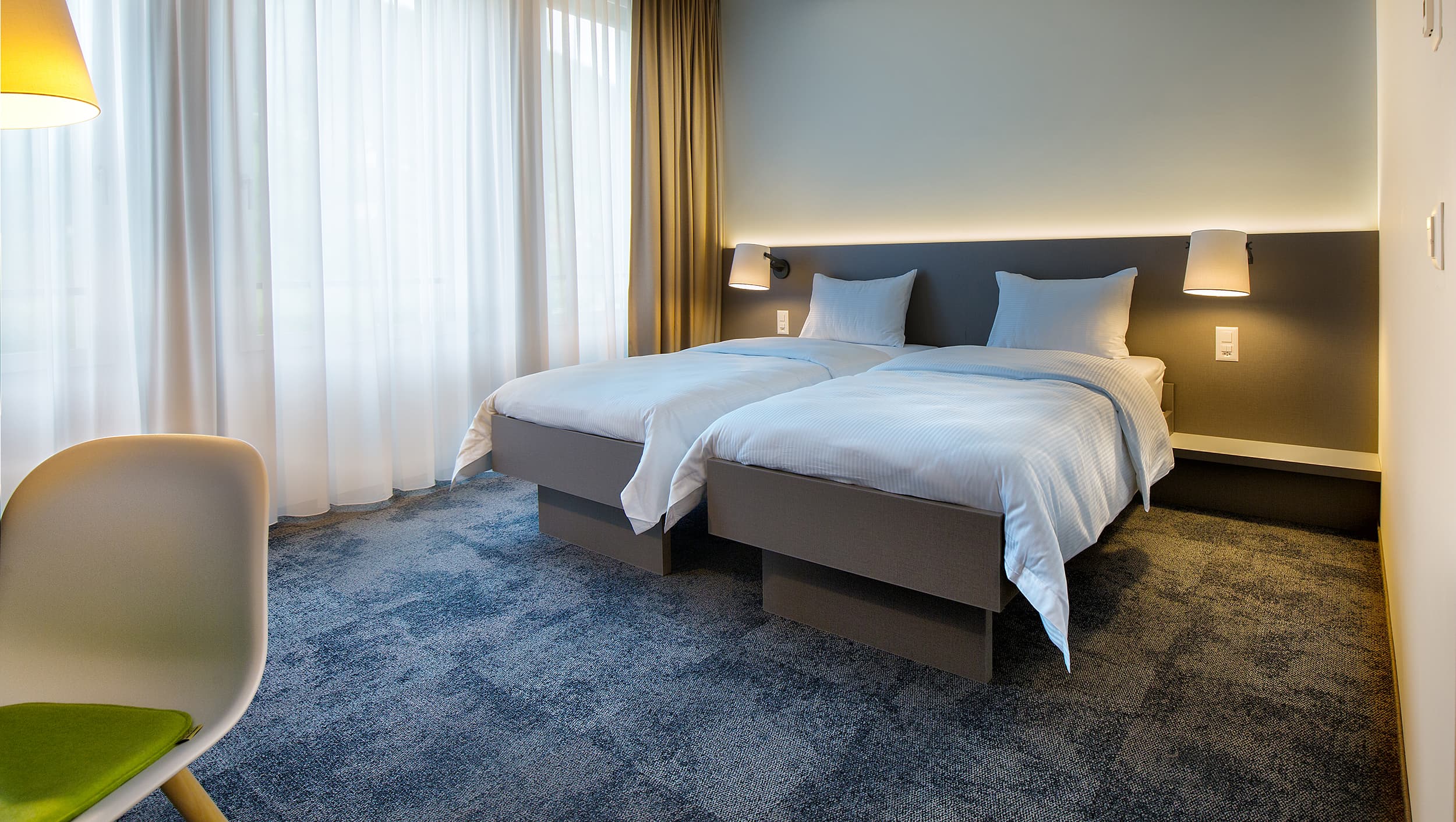 The rooms are modernly furnished and equipped with a spacious desk, ideal for business travellers or for guests who want to work during their stay. The beds can be moved so that you can organise the room according to your wishes.