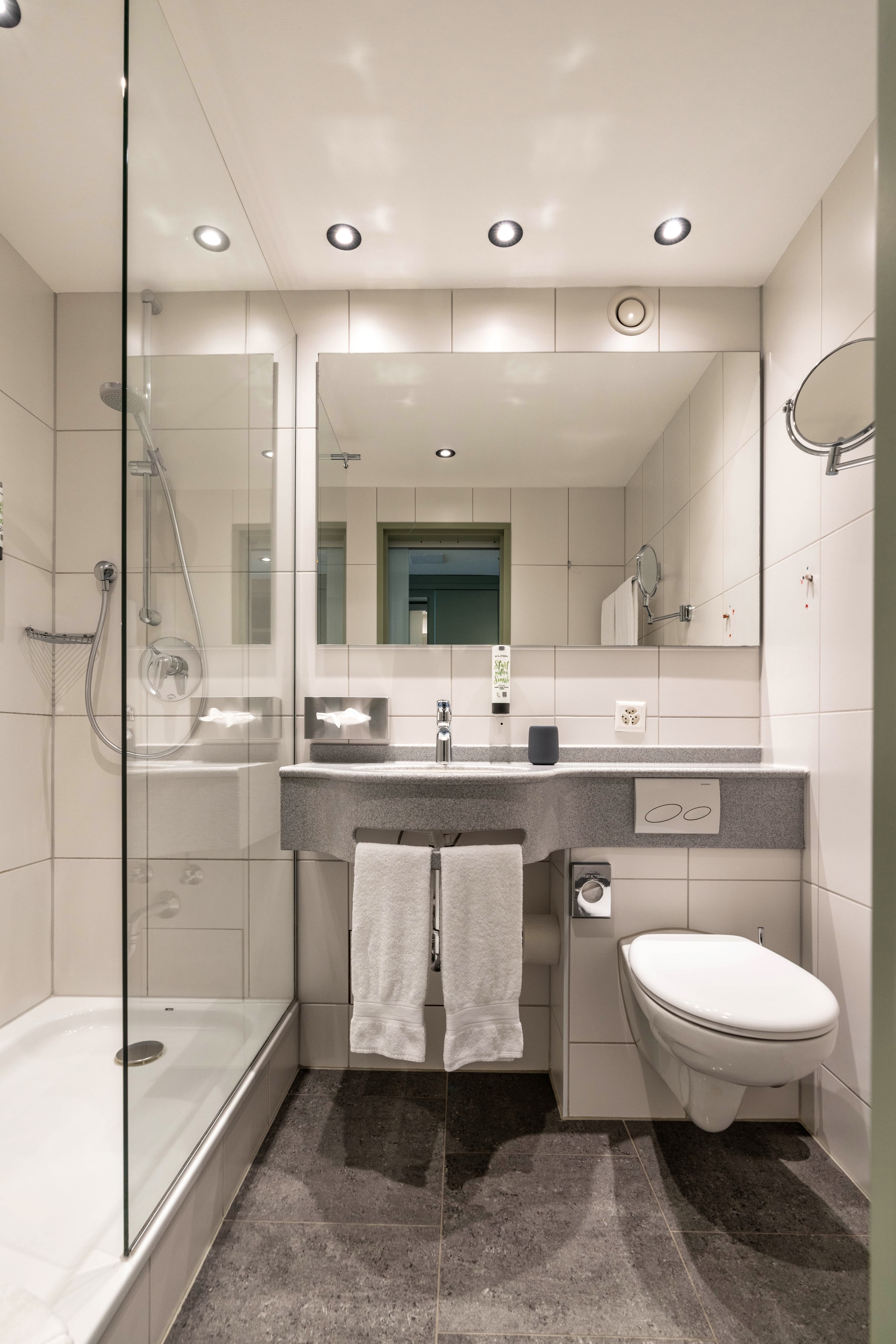 Geniessen Sie den Komfort eines gut ausgestatteten Badezimmers mit Dusche/WC und einem praktischen Schreibtisch, der sich perfekt für Geschäftsreisende eignet.